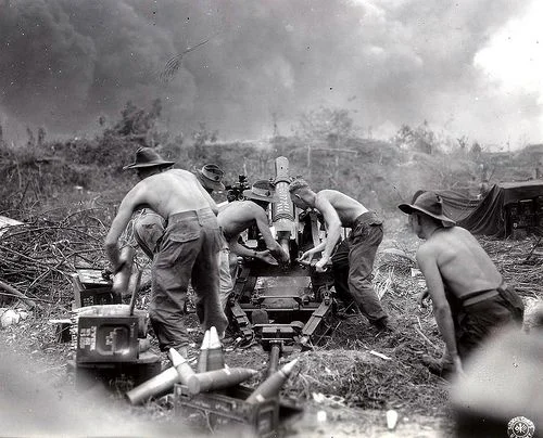 Australian Gunners of the 2/4th Field Regiment, RAA 71st Infantry Division were fired on the Japanese with a short version of the British 25 Pounder gun during the invasion of the island of Borneo in the Dutch East Indies July 1945